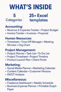 It’s a comprehensive digital download packed with fully editable Excel spreadsheets covering accounting, HR, budgeting, project management, marketing planning, and more. Designed for solopreneurs and small teams, it delivers enterprise-level organization in a user-friendly format.